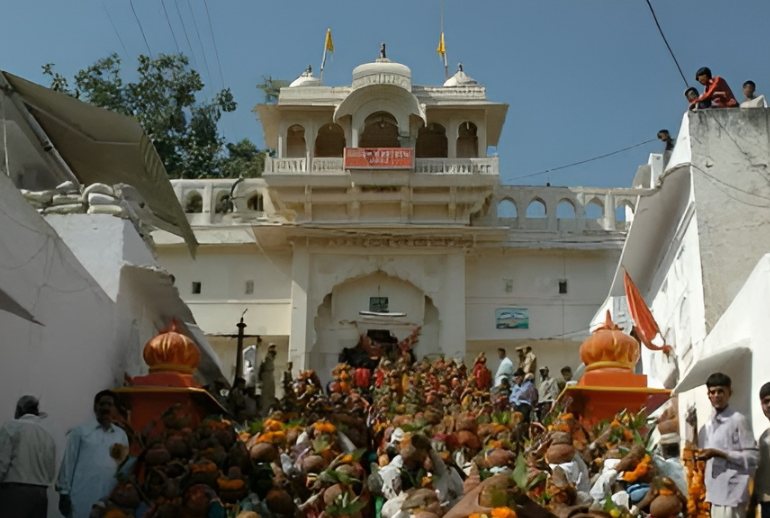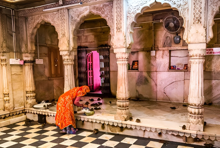 The Karni Mata Temple at Deshnok is a beautiful structure made of stone and marble, inside which resides an image of Karni Mata. The image is decorated with a ‘mukut’ (tiara) and garlands. The images of her sisters and the sisters of Avad Mata give her company on either side. The temple is known the world over for the presence of kabas (rats) that roam freely within the temple precincts