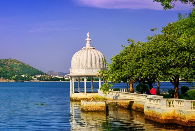 This delightful lake, bordered by hills and woodlands, lies to the north of Lake Pichola. This artificial lake is connected to Lake Pichola by a canal. The lake houses the beautiful Nehru Island as well as an islet on which stands the Udaipur Solar Observatory. It was inaugurated by the Duke of Connaught and was initially called Connaught Bundh.