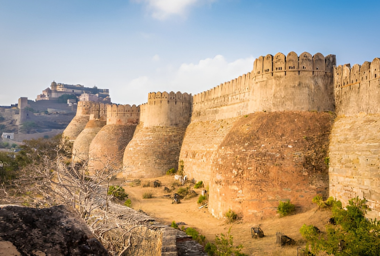 BIRTHPLACE OF MEWAR'S LEGENDARY KING, MAHARANA PRATAP. Located 84 kms north of Udaipur in the wilderness, Kumbhalgarh is the second most important citadel after Chittorgarh in the Mewar region. Cradled in the Aravali Ranges the fort was built in the 15th century AD by Rana Kumbha. The inaccessibility and hostility of the topography lends a semblance of invincibility to the fort. It served the rulers of Mewar as a refuge in times of strife. The fort also served as refuge to King Udai of Mewar in his early childhood when Banbir killed Vikramaditya and usurped the throne. It is of immense sentimental significance for the people being the birthplace of Mewar's legendary king Maharana Pratap. The fort is self-contained in all respect to withstand a protracted siege. Its defences could be breached only once by the combined armies of the Mughal and of Amber primarily for scarcity of drinking water. There is a magnificent array of temples built by the Mauryas of which the most picturesque place is the Badal Mahal or the palace of the clouds. The fort also offers a superb bird’s eye view of the surroundings. The fort's massive wall stretches some 36 kms with a width enough to take eight horses abreast. Maharana Fateh Singh renovated the fort in the 19th century. The fort's large compound